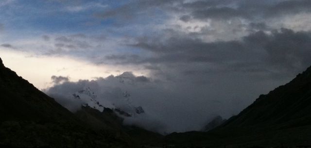 We arrived at the lower EBC around 18h30 – only the base of Everest visible though. EBC is a large rectangular, baren and dusty clearing lined by ‘Hotels’ and has a post office but no mains power or running water. Probably will have all that and a cable car in a few years if the rest of China is anything to go by. Our driver pulled up to ‘Holy Mountain Hotel’, a large semi-permanent tent with comfortable sleeping space for 5 and an attached kitchen. Our host provided bottomless cups of green tea as we sat chilling out after the long day on the road while occasionally popping our heads out into the cold thin air to check the view status.