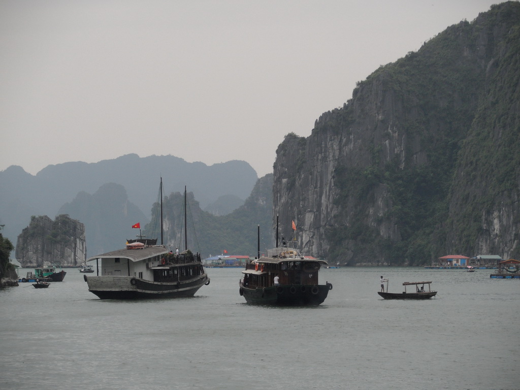 The day dawned heavily overcast after a rainy night. Not ideal conditions for a tour on Ha Long bay but we were hoping it would clear. We boarded a 30 seater full of westerners and headed out of town. Over three hours later we arrived in Ha Long city. Only four of us on the bus had opted for the el-cheap-o trip (2 days, 1 night) and we were immediately demoted to another tour group. The bay at Ha Long was surprising – packed with tourists being led about in groups while junks jostled for position on the piers. Our new group made my ears itch instantly as the loud affected twang of SAFA accents bellowed forth. On board we were provided lunch as we drifted out into the bay.
