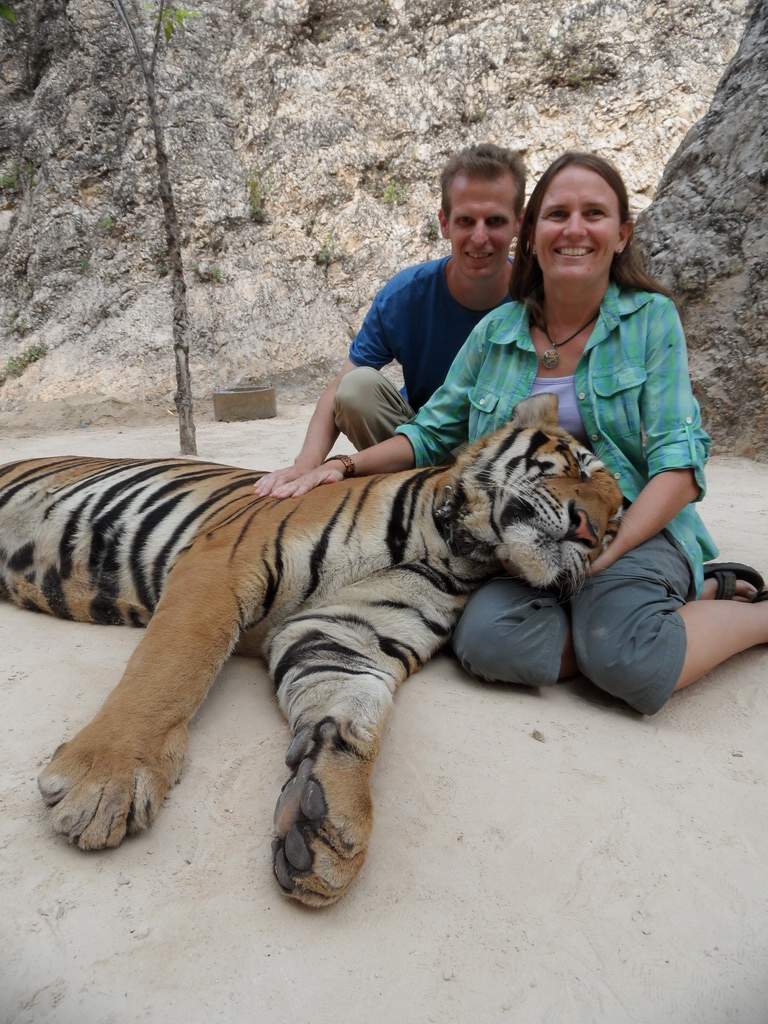 BTW the foto with me standing next to a tiger with Sim looking down at something? He was looking at a big steaming stream of tiger pee as the big male marked his territory on the way back. It just missed our feet! Apparently getting sprayed with tiger pee is good luck in Thailand. So I guess we have got ‘almost’ good luck then.