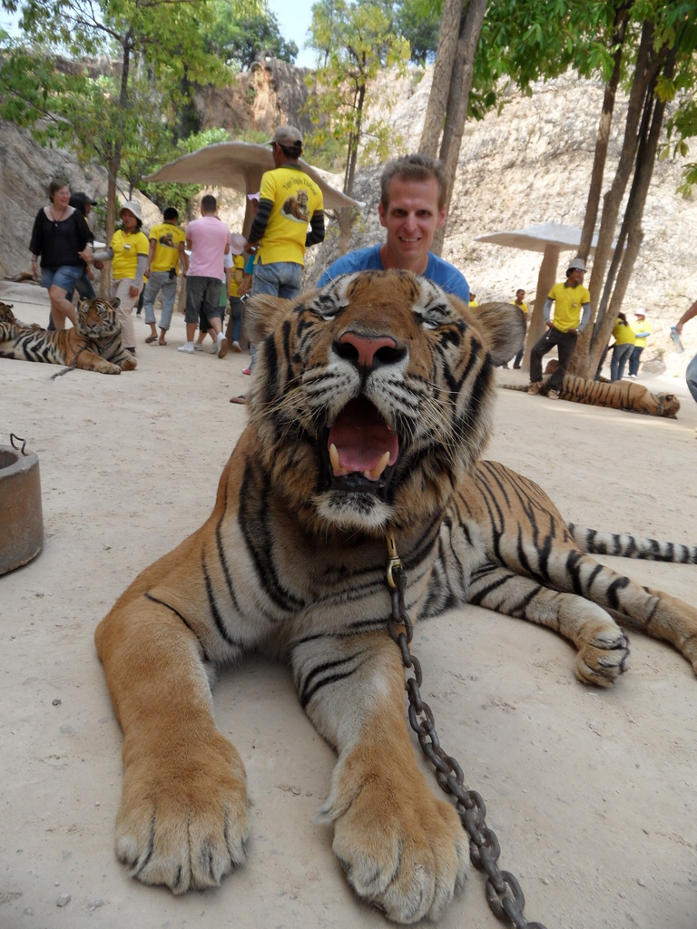 We arrived at the ‘tiger canyon’ to find about a dozen tigers all chained up. Some on some rocks, but all in the shade and all but one fast asleep. After a brief intro on how it all works we paid a thousand Baht extra to have a photo with the both of us together and me holding one of tigers heads in my lap. This is an extra on top of the individual photos you get of you on your own with the tigers which is included in the entrance fee. All the tigers had one handler looking after them and we were led by the hands by one of the many many staff to our first tiger. The Tigers head was plopped directly in my lap and he barely moved he was so fast asleep (I can understand why there are rumors of drugging). Our guide then snapped photos of us with the huge beast before leading me on to another tiger to get a shot of me on my own. We were then led by hand back to the start to drop Sim off so that I could be led around to get my picture taken with about a half dozen different tigers before they did the same with Sim.