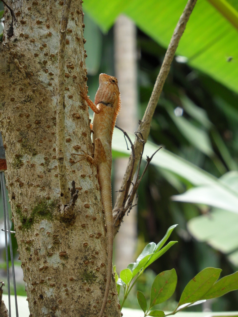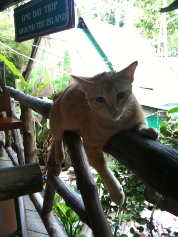 After a nice relaxed lunch we set about the usual tedious task of finding a place to lay our heads for the night. We enquired at one of the beach front resorts but at 2000 Baht (+/- Β£40) a night for a room, we moved on inland, waay inland. We found a nice little wooden bungalow for 300 Baht in a pleasant setting up against the jungle and the cliffs. There are some serious wood borer or something munching away in the wooden columns though. We could hear them gnawing away. Dont know how long these wooden places will last. Guess that is why they are building new concrete ones. Β There are also loads of cats in this place! We counted half a dozen on the walk to our bungalow alone. Some cute friendly kittens too. Not just by us but also all around the peninsula.