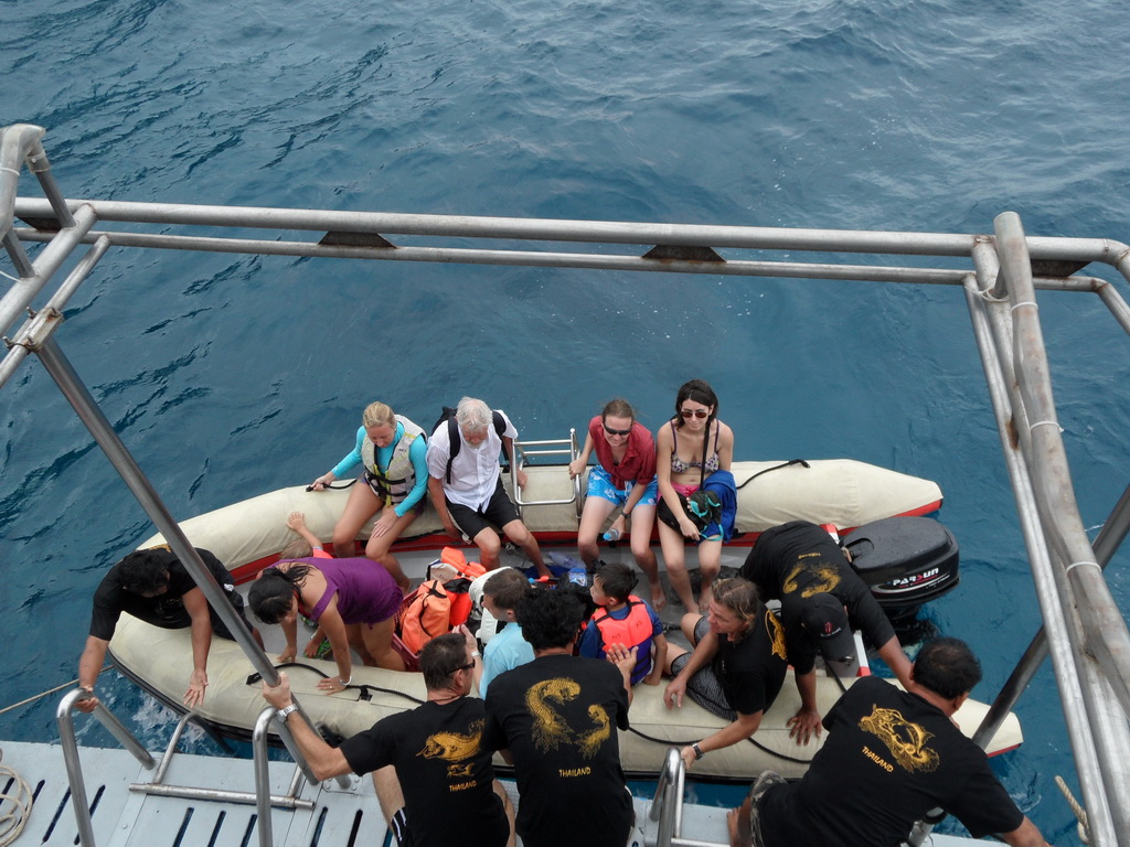After three hours of that nonsense we arrived near Koh Bangu Island. V and the rest of the snorkelers were sent off by rubber duck to Sail Rock beach while Elanor and I were dropped in the rolling seas at ‘Three Trees’. We descended immediately and what an amazing experience! 40m of visibility. Everything felt calm even with a light current and surge – we just went with the flow. The sea life was stunning – we saw a pair of cuttlefish courting, a very large trigger-fish and a mid sized turtle amongst thousands of other fish and corals (I was concentrating on breathing and my skills so my recollection is just one of ‘WOW’ with very little detail). It was awesome. We were down at 12m (the max allowed for the first dive) for 56 minutes – I would have loved to have stayed all day!