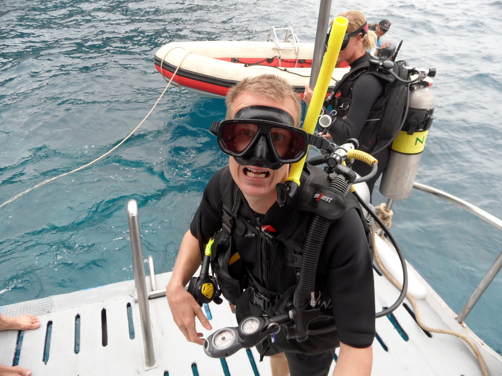 Our second dive was at Palong. I was feeling pretty grim during the break, but again felt better once in the water. My last few tasks included BCD and weight removal (easy), hovering (also easy) and the dreaded mask removal. I absolutely detest this task and for me it is always the hardest. Once done though, it meant that I had completed all my skills. Stephan then let Sim and me buddy each other and lead the way while he trailed behind keeping an eye on us. It was great. Visibility wasn’t as good as the other dive site, but it was nice to cruise around and get used to just swimming near each other and checking out the sights at our own pace. We both got a bit of a fright when we spotted a black tipped reef shark, and then another and another – they were surrounding us! There were probably half a dozen of these ‘harmless’ adult sharks maybe 10m away from us. Scary and awesome at the same time. We finished off our dive exhilarated and completely knackered in my case (also with numb thumbs and toes again).