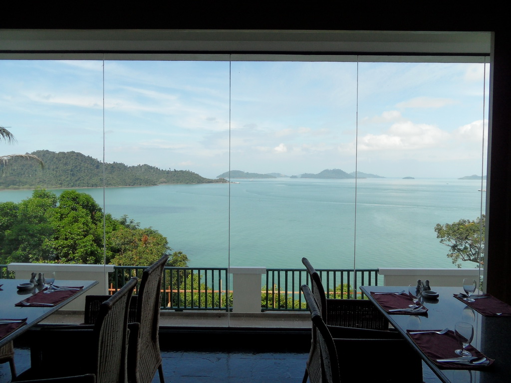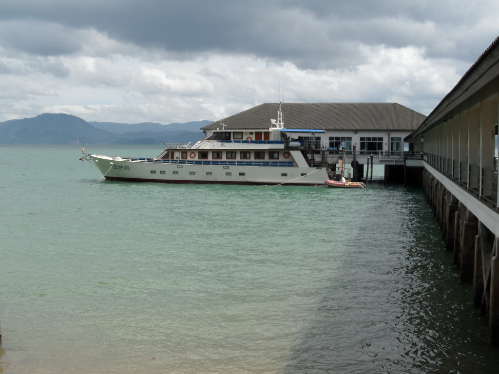 [Pictures: The view from the Andaman Club. Our boat at the pier – border crossing in style]
