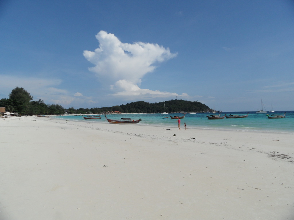 We headed out at around 50km/h (I checked) and had no trouble on the calm seas. First stop was at Koh Tarutao (an island that is a national park/marine preserve and was once a prison – it now has a few parks board run cabins). Then on to Koh Lipe. Getting to the beach on Lipe is a little cheeky. The ferries stop at a barge about 400m out to sea and you have to pay B50 for a longtail to shore. Anyway we arrived and strolled along the beach until we found a good spot at Pattaya 2 Bungalows. It was a choice of B800 a night for one with electricity and pay-as-you-go WiFi that was set off the beach or B500 a night for a basic spot overlooking the entire beach from the far end. We chose the latter.
