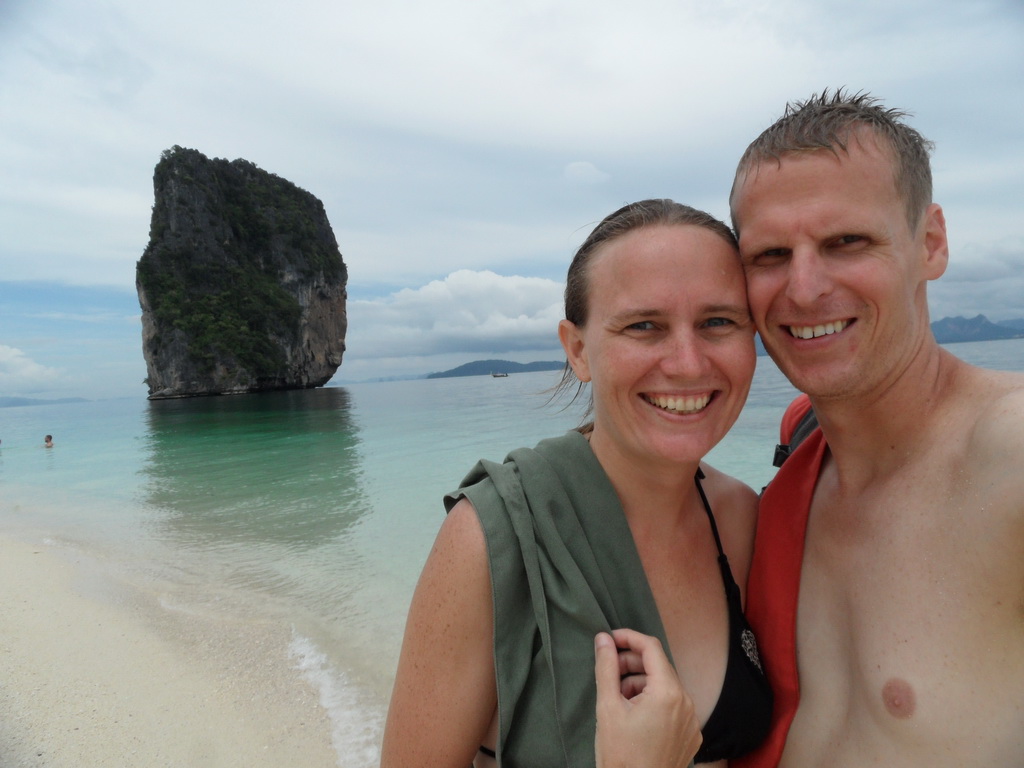 From the crags we headed around to the trail that leads up to the viewpoint. The scramble was steeper than I recall and slippery after the recent rains but worth the effort as I’m sure Jackie and Shane will remember π The views are amazing. What a spot. We passed a few others on the way down managing to escape with less red-clay splodges than most (our climbing skills hard at work). Following the path around brought us to the still perfect Pra-nang beach with it’s crowds, crystal clear water and towering limestone cliffs. After a walk along the beach past Happy Island we took a short dip. As I got out a storm cloud rolled in sending us looking for cover and some lunch.