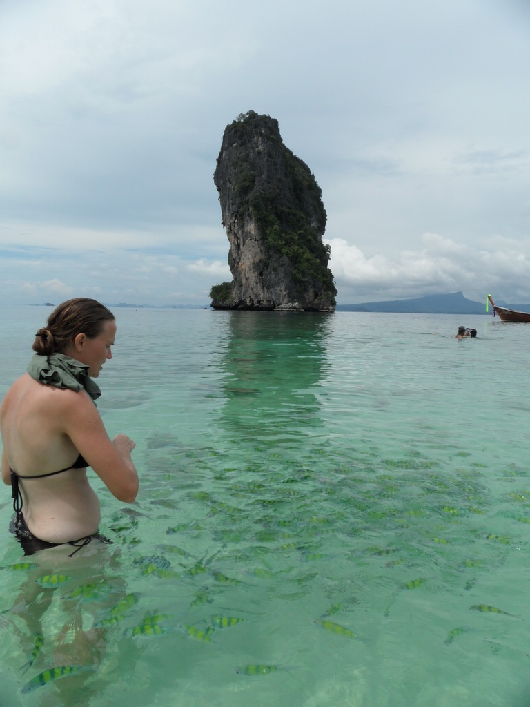 I absolutely loved feeding the fish with some left over rice. It’s wonderful how close to the shore these guys come. Less than 2m into the water and you can be surrounded by them. They get a bit cheeky though and occassionaly nip your legs in the feeding frenzy. I know that the fish and snorkelling here are pretty boring compared to the rest of Thailand, but I had a ball nonetheless and so did Sim.