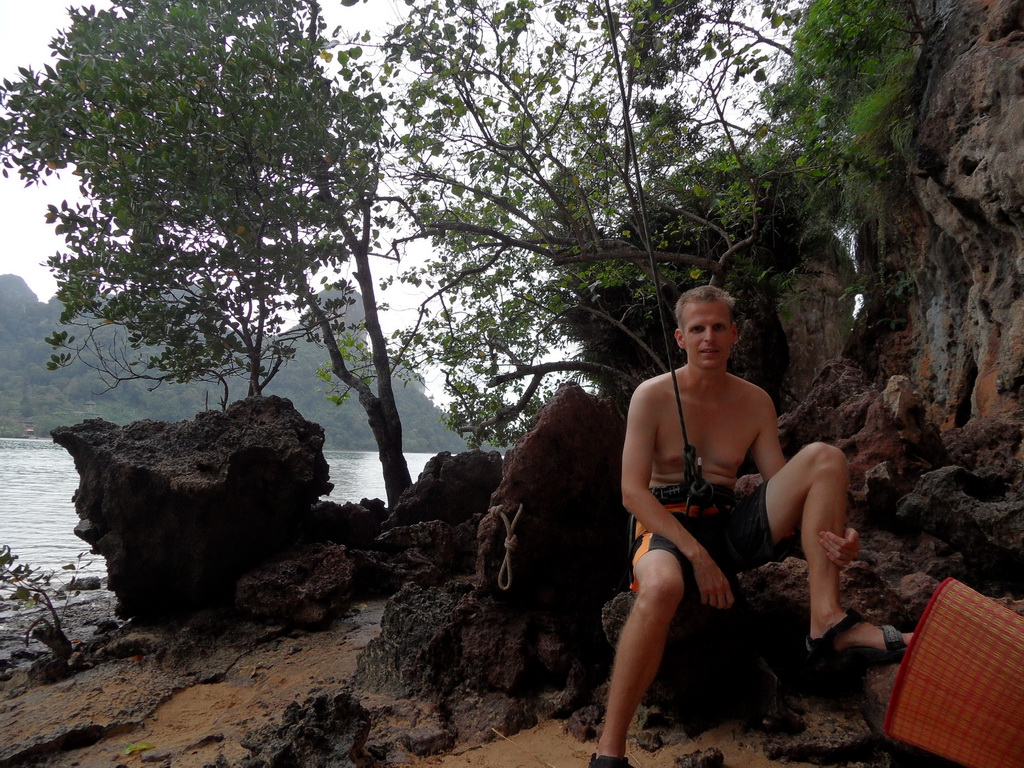 A decent pizza later the clouds started to clear and the sun came out. We were both glad we had decided not to pack it in for the day and headed off to Tonsai beach. Al’s favorite route (Pan Talod) was very busy with a queue so we sat in the shade and watched. Eventually we decided to head over to the famous ‘Groove Tube’ at the other end of the beach. A muddy scramble, a battle with vicious mozzies and a short wait for the route got us a turn. What an amazing climb – we thoroughly enjoyed it. The views from the top did not disappoint. I remember lugging Andrew’s camera up to take shots of him and Al coming up through the ‘tube’. This route deserves it’s almost legendary status.