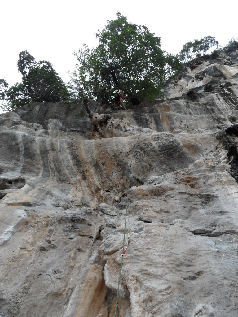 It was then back to the business of what we had planned to do since before leaving the UK, climbing Pan Talod. Seems either I have the name of the route wrong (not possible) or the route directory we used today calls it by another name (Schlingel Moritz). In any event it didn’t matter. I know the route well. It was undoubtedly Al’s favorite route in the world and the best rated 6a in Pra Nang. Not a terribly difficult route back in the day. Extremely long reaches to good holds around some impressive roofs make it look very cool and a lot harder for shorter people. Big power moves on good jugs – Al’s kinda climb π As I got ready I felt nervous about making it to the top – 15m with 2 bolts and 3 slings after the hardest day’s climbing in years and 10kg extra on my belly.