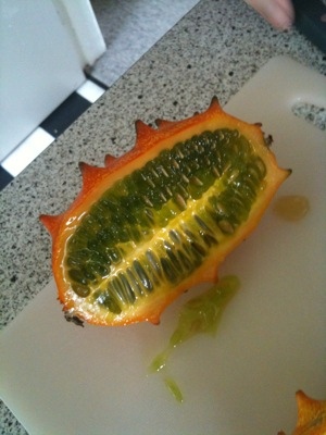 We came across some odd fruit as well. The Kiwano, according to the sign, tastes like a mixture of banana and lemon. Such an odd looking thing, but just like a Dragon Fruit it looked much more interesting than it tasted. We found it on Wikipedia – turns out this ‘Product of New Zealand’ is really an African horned Mellon, part of the cucumber family – yuk!