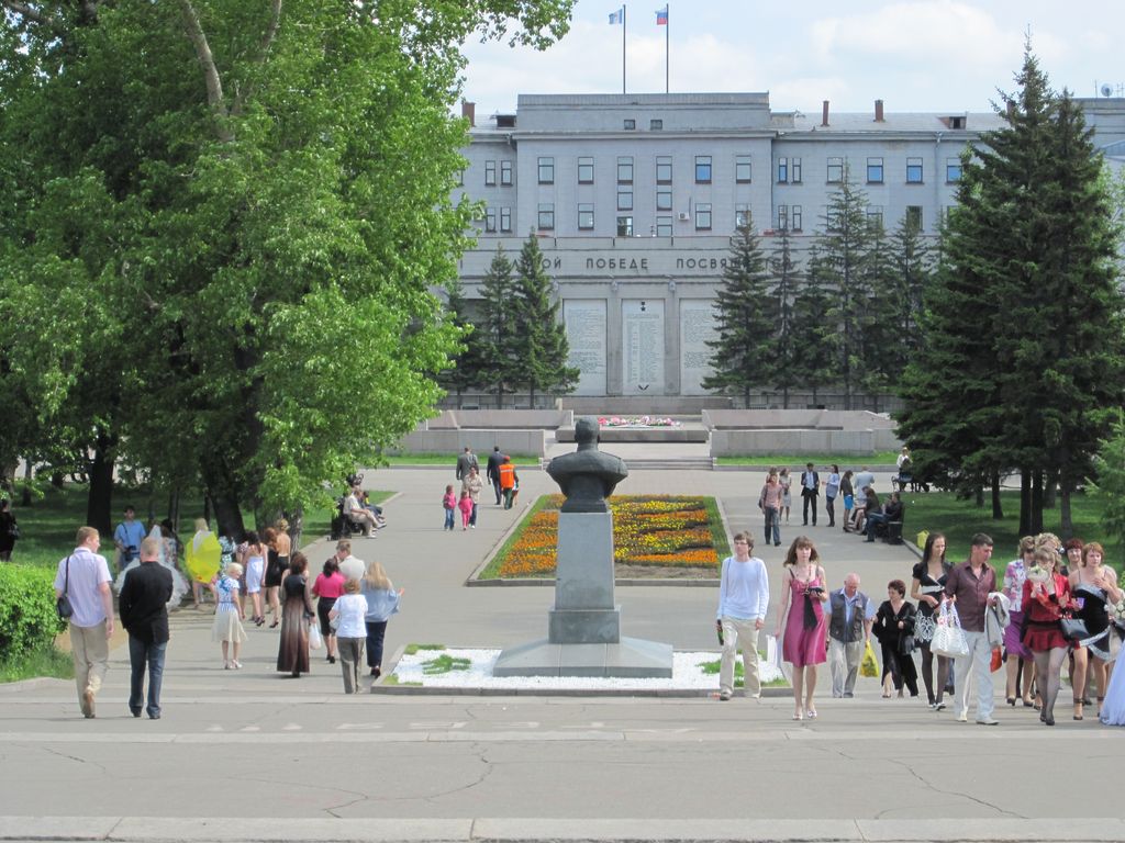 Our final destination on the very long hot walk back to the train station was a Soviet WWII memorial and eternal flame. The surrounding park was filled (well I counted 5) with wedding processions and their photographers. We’ve seen flocks of wedding parties out in the parks all around Russia on just about every day of the week. Limos and stretched Hummers are the order of the day here – seems like a good business to be in!