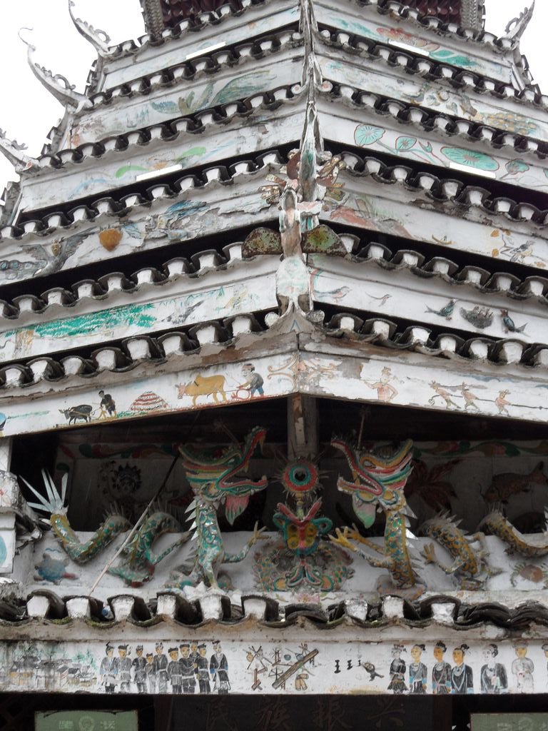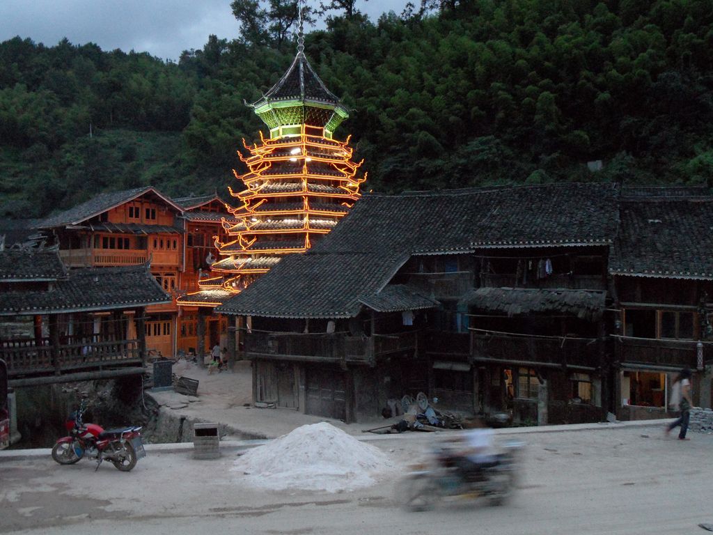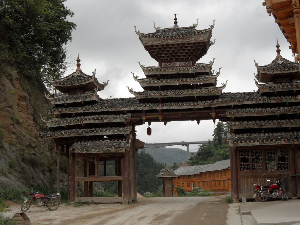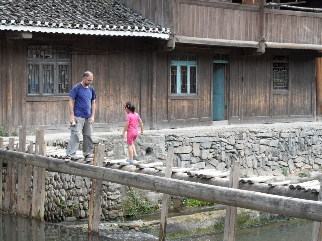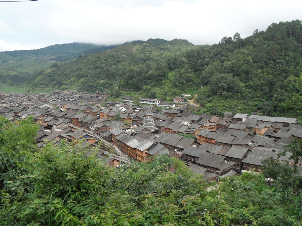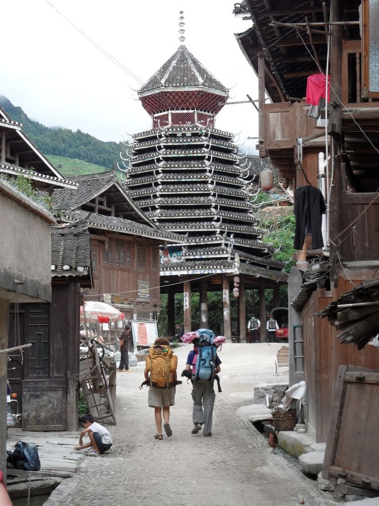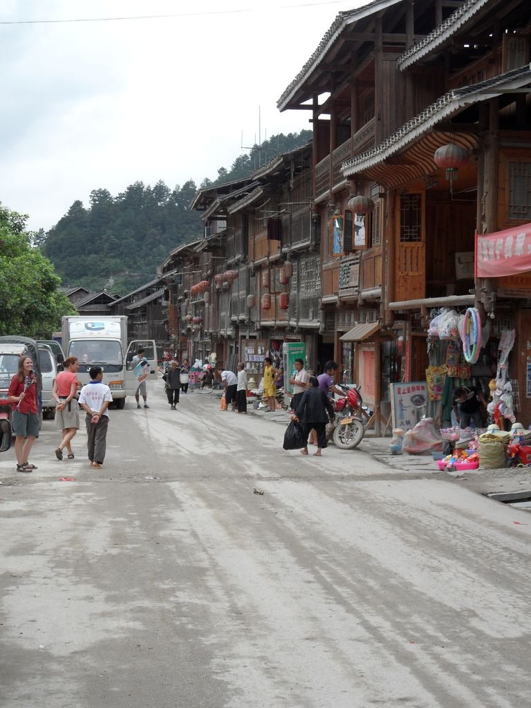 The road conditions were the worst we have seen yet. The bus bumped and ground its way along a large river and through mountain passes for a hour or so before we were ushered off the bus. The road ahead was impassable so we needed to walk 500m on muddy paths and across a rickety bridge to a bus waiting on the other side. Our new bus and driver had even less respect for Newton’s laws. A buttock tightening ride led us up, over and down treacherous mountain passes finally grinding to a halt at Zhaoxing terminal (an arb spot on the ‘main’ and only road through the village). We were happy to be once again in control of our direction and speed ! On the way we had seen new tunnels and massive bridges under construction – the rivers of concrete flowing as fast as water once again.
