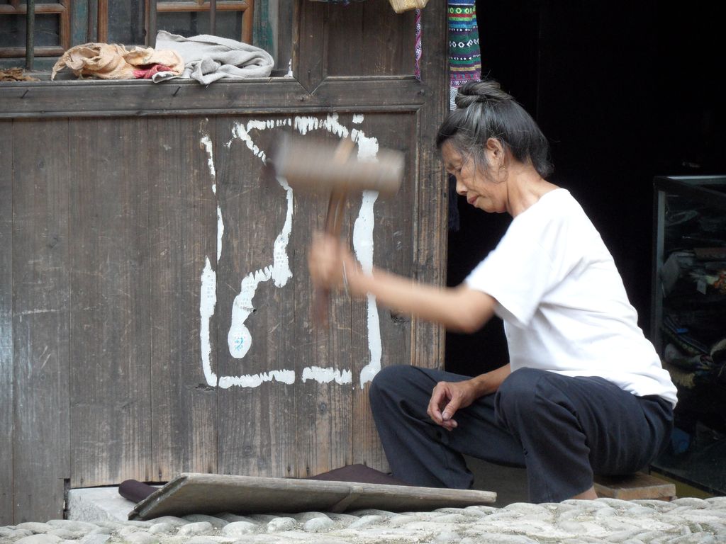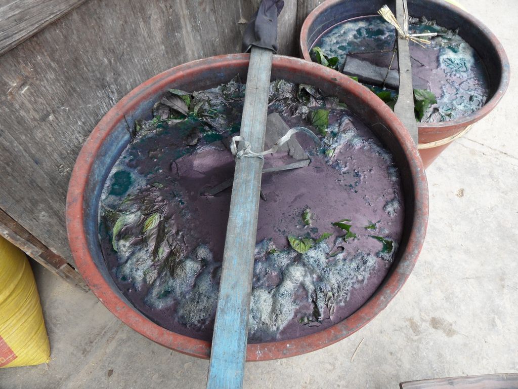 The villagers seem to be almost completely involved in the production of dyed cloth. They extract a solution from plants which turns deep indigo after it oxidizes. Fabric is then dyed, dried and pounded with a mallet until it is shiny (ends up looking a bit like silk but not quite). No matter where you are in the village you can hear mallets endlessly drumming cloth on top of stone tablets – there has got to be an easier way. The ladies dresses are all pleated in a similar way. The fabric is carefully folded in ~10mm pleats, bound to a board and hammered. It’s a noisy place and not much escapes the dye – the hands of most are stained and even the dogs have the odd patch.