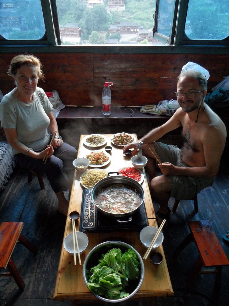 Obviously V could not join us for the dinner that Mama Lee had prepared for us. I got to try some rice wine (basically Saki) and the food was very good (I’ll take R&S’ word for it on the main dish since the fish head hotpot was not my cup of tea). The three of us had an entertaining meal chatting away while V was curled up in a ball waiting for her meds to start working. Hopefully she feels better by the morning – if not we will stay another day here.