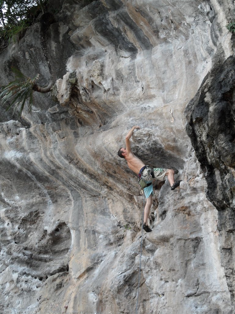 It was then back to the business of what we had planned to do since before leaving the UK, climbing Pan Talod. Seems either I have the name of the route wrong (not possible) or the route directory we used today calls it by another name (Schlingel Moritz). In any event it didn’t matter. I know the route well. It was undoubtedly Al’s favorite route in the world and the best rated 6a in Pra Nang. Not a terribly difficult route back in the day. Extremely long reaches to good holds around some impressive roofs make it look very cool and a lot harder for shorter people. Big power moves on good jugs – Al’s kinda climb 🙂 As I got ready I felt nervous about making it to the top – 15m with 2 bolts and 3 slings after the hardest day’s climbing in years and 10kg extra on my belly.